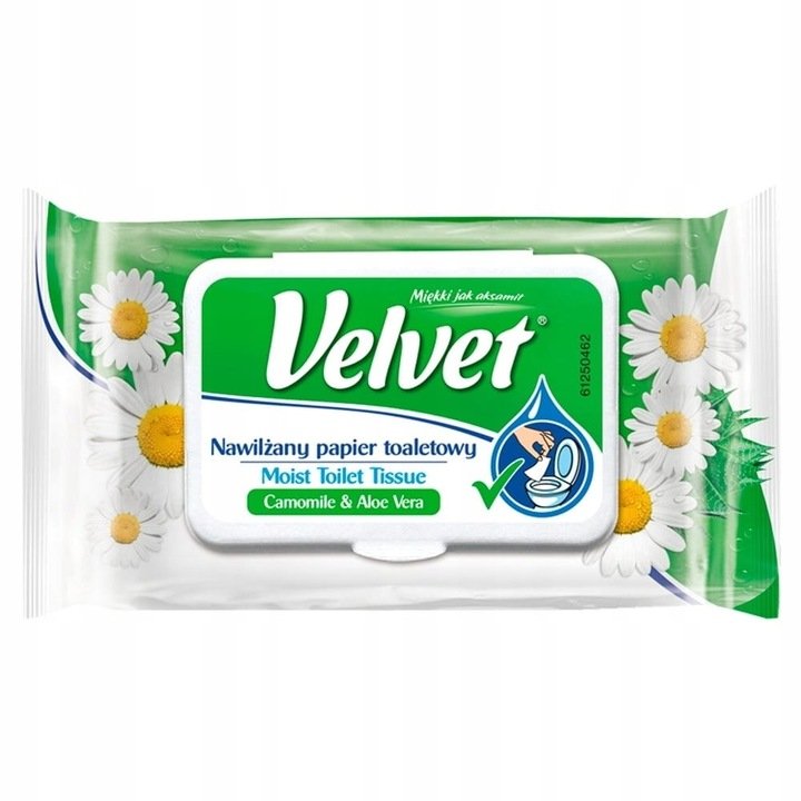 Papier nawilżany Velvet rumianek z dodatkiem aloesu delikatnie oczyszcza i odświeża skórę podczas wizyt w toalecie oraz w podróży. Miękka włóknina i kojący zapach rumianku zwiększają komfort, a praktyczna klapka chroni chusteczki przed wysychaniem. Materiał jest biodegradowalny; zużyte chusteczki spłukuj pojedynczo.